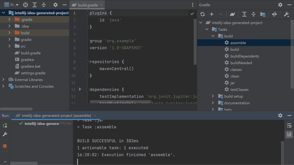 In the build script IntelliJ IDEA has applied the java plugin and added default configuration, based on our previous selection.