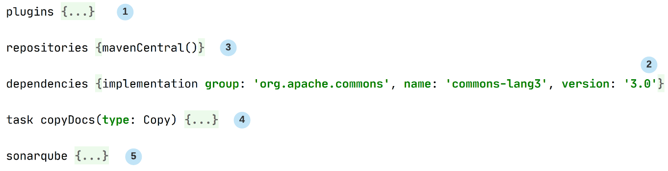 }This is important to know, because in many build.gradle files the majority of what you see is configurations for various plugins. If it's not clear what plugin the configuration block refers to, check the list of plugins at the top, or Control + Click the configuration block name (in IntelliJ IDEA) to jump into the plugin source itself.