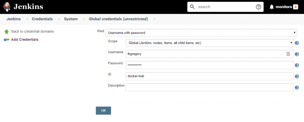 Finally we're here! Now add a Username with password credential, entering your Docker Hub username, password, and an id of docker-hub. Click OK to save your credentials in Jenkins.