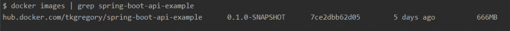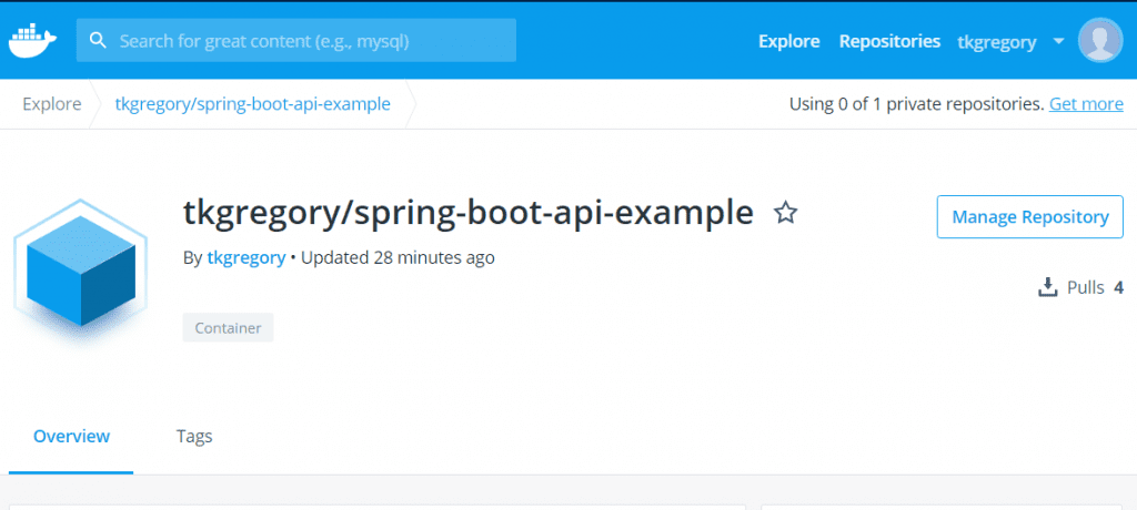 Now over in Docker Hub you'll be able to see your image in your own account repository at https://hub.docker.com/r/<your-docker-hub-username>/spring-boot-api-example:
