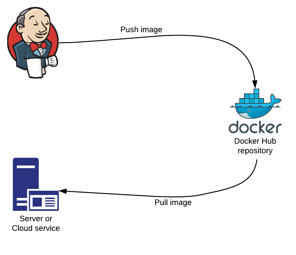 In a real-world scenario we're going to need to push our Docker image to a remote repository in order to then pull it onto a server or cloud service to run it. Our setup, from the point of view of our continuous integration service (i.e. Jenkins) might look like this: