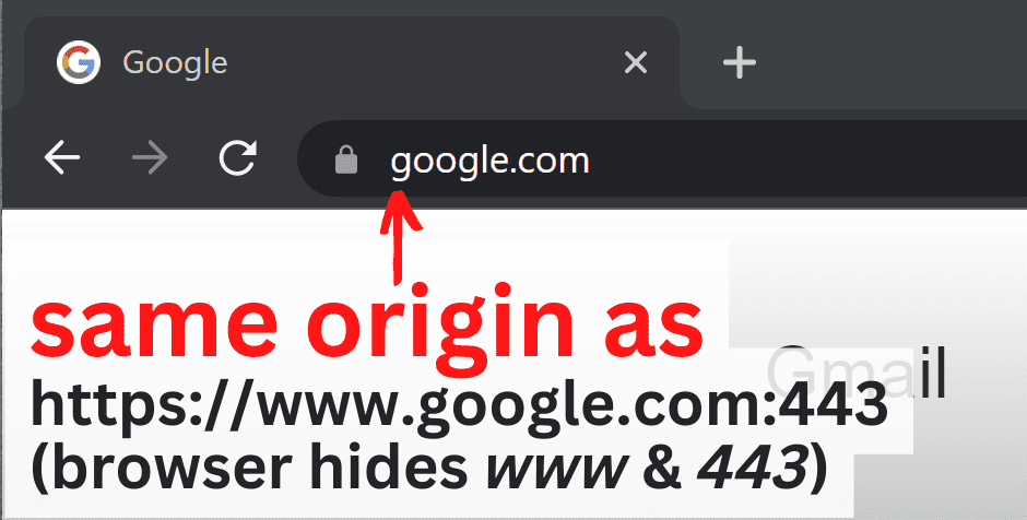 An example of an origin is https://www.google.com:443. That's the same as https://www.google.com shown in the browser address bar, which assumes port 443 by default.