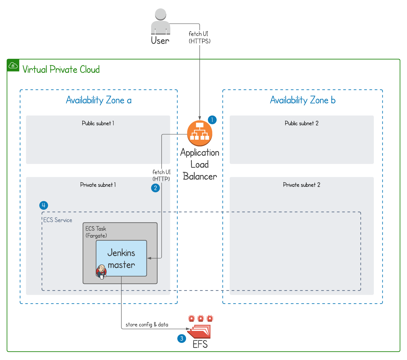 2 public and 2 private subnets - Jenkins will be deployed to one of two private subnets, each in a different availability zones