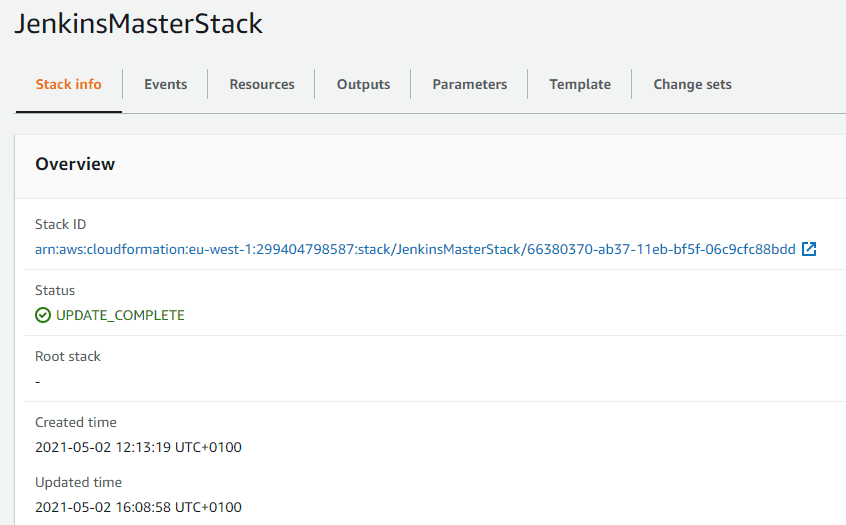 After a few minutes the deployment should succeed. Within the CloudFormation area of the AWS Console the JenkinsMasterStack will show in a completed status.