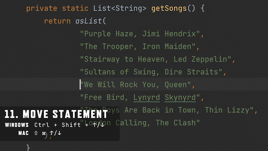 | 11. Move statement | Ctrl + Shift + ↑/↓ | ⇧ ⌘ ↑/↓ |