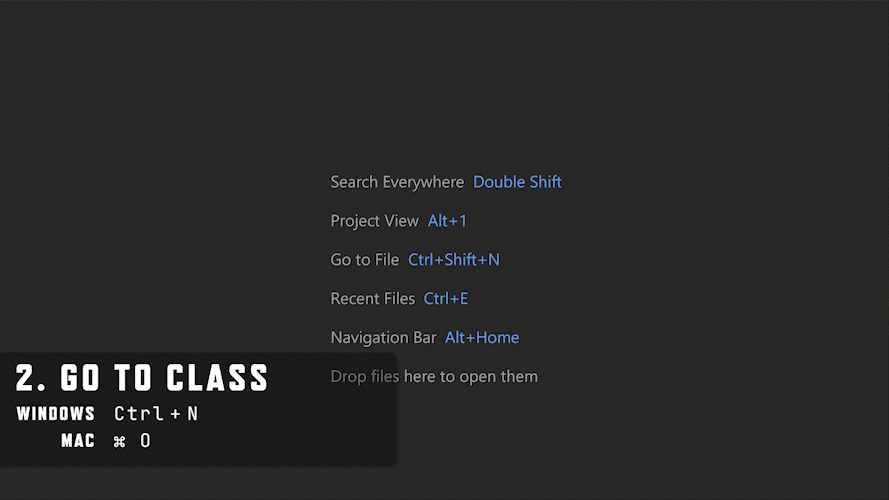 | 2. Go to class | Ctrl + N | ⌘ O |