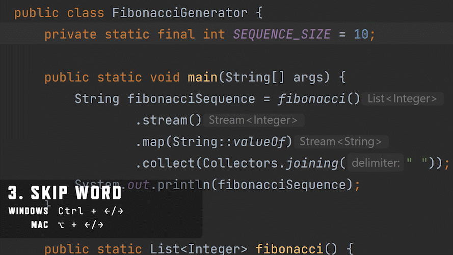 | 3. Skip word | Ctrl + ←/→ | ⌥ + ←/→ |