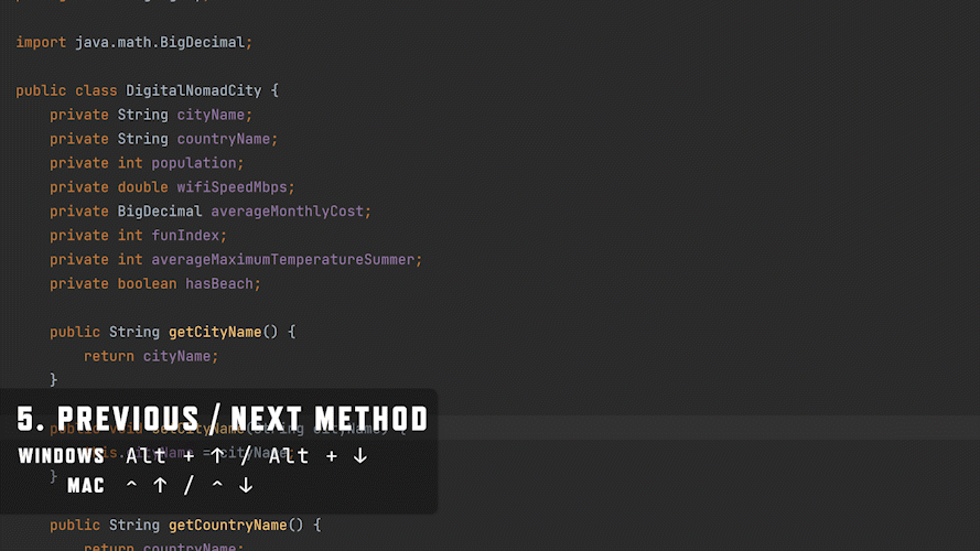 | 5. Previous / next method | Alt + ↑ / Alt + ↓ | ⌃ ↑ / ⌃ ↓ |