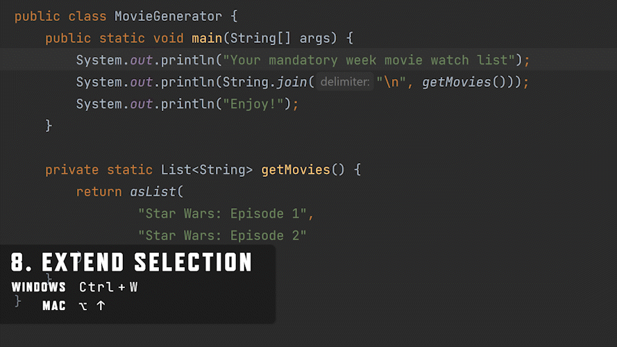 Another way to select text is with Ctrl + W, IntelliJ IDEA's extend selection tool. It progressively selects more and more code.