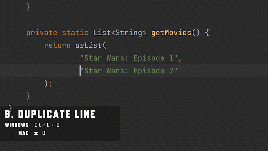 | 9. Duplicate line | Ctrl + D | ⌘ D |