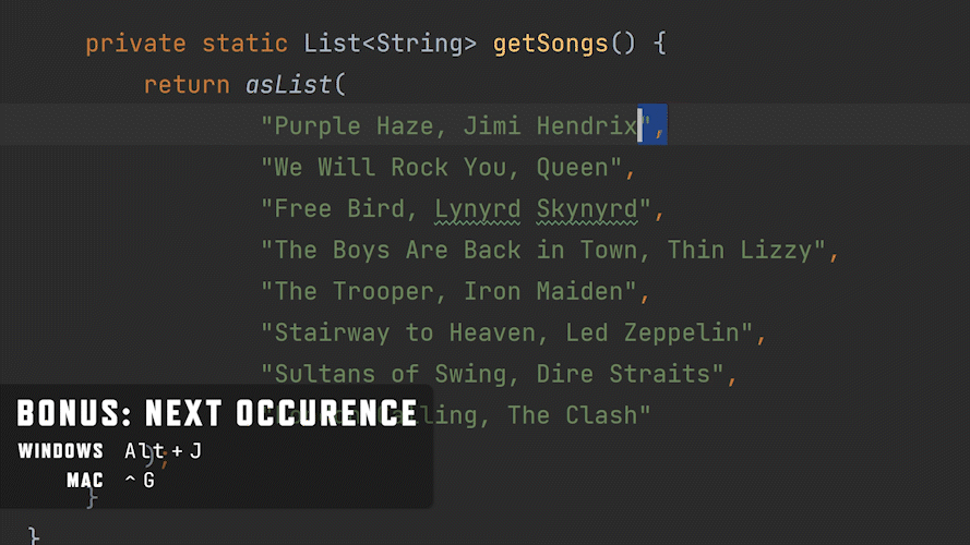 | Bonus: Next occurrence | Alt + J | ⌃ G |