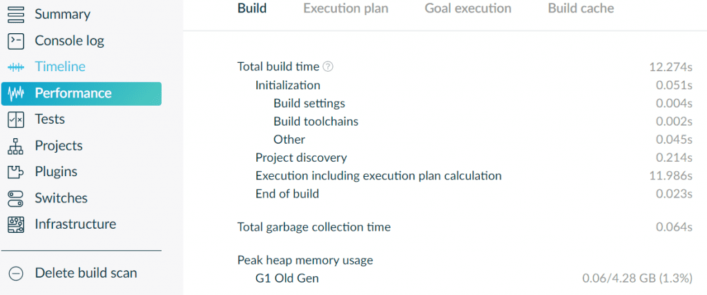 Now let's run a scan on our Gradle build using ./gradlew build --scan and compare with the Maven build scan: