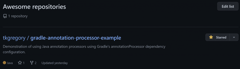 On the Your stars page, I now have all my repositories organised into an appropriate list. Neat!