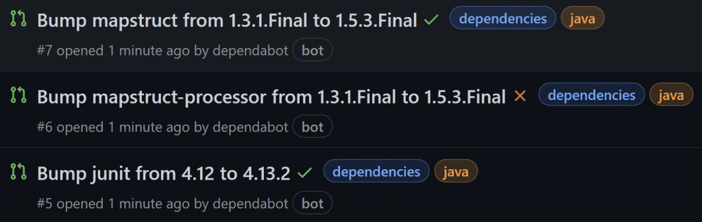 The cool thing is that each of these pull requests can trigger a GitHub workflow, so you can test that each suggested version update is compatible. In the example above, 2 of the 3 pull requests passed my tests. I can merge them right away, while fixing the failure manually.