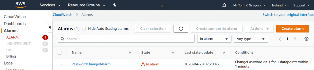 In a scenario where you need to know about password changes, manually checking the CloudWatch logs is going to become boring very quickly. Fortunately the clever folk at AWS have a solution for us with Metric Filters and Alarms. This allows the process to be automated and to receive an alert when someone changes their password on the EC2 instance.
