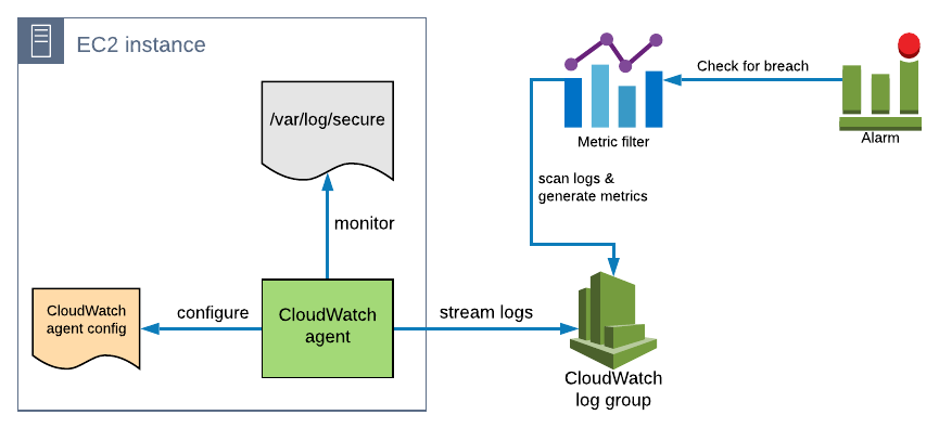 - a CloudWatch agent on that instance that streams the /var/log/secure log file to CloudWatch. This log contains authentication information such as user logins and password changes.
