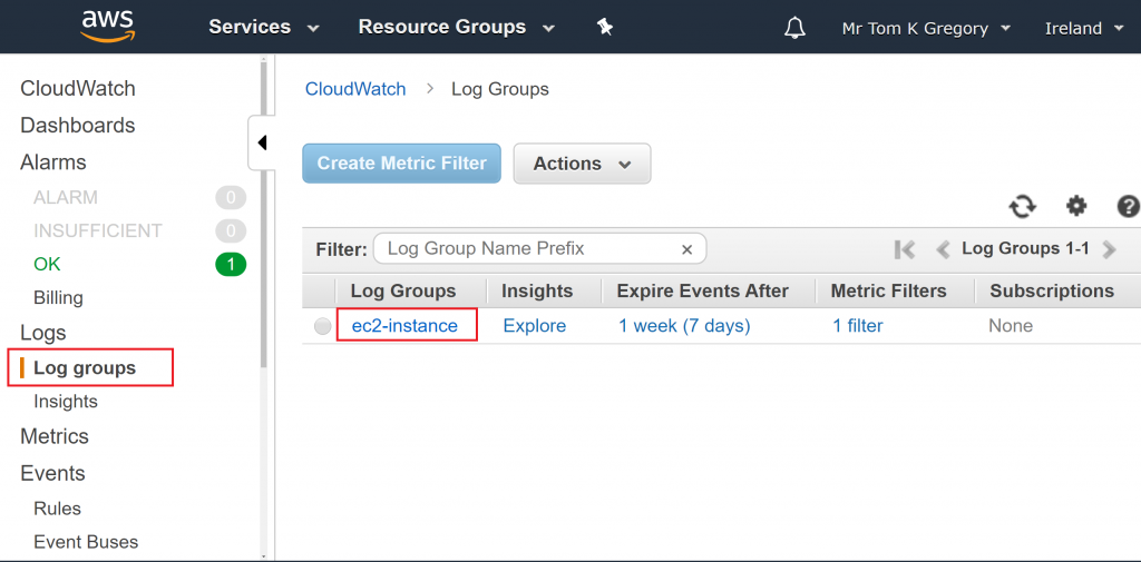 Click on Log groups in the left hand navigation, then select the ec2-instance log group: