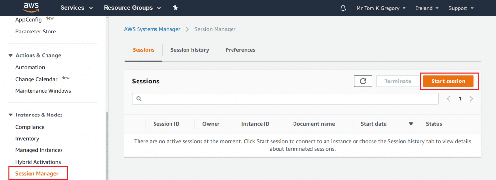Select Session Manager from the navigation on the left. This page lists any current sessions. We want to create one, so click Start session: