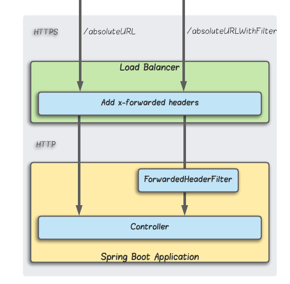 When I run curl https://forwarded-header-filter-example.tomgregory.com/absoluteURL I get a response of http://forwarded-header-filter-example.tomgregory.com/absoluteURL. Wrong protocol. 😢
