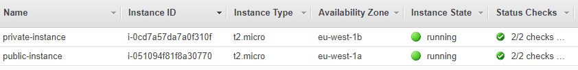 Note down the public IP address of your public instance, and the private IP address of your private instance. We'll need these later for SSH access.