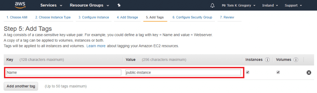 On the Add Storage page just click Next. Then on the Add Tags page we'll add a Name tag with value public instance, and click Next: