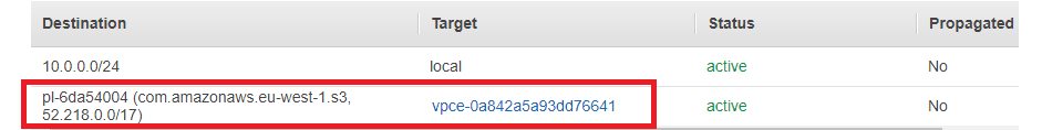 The image below shows a route table which has the S3 endpoint included. We have a route for requests with a destination s3.eu-west-1.amazonaws.com to target the VPC endpoint. Therefore any S3 requests will be routed through to S3.