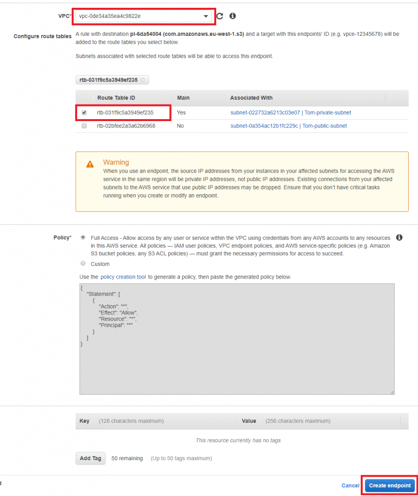 Next up we need to select where we want the VPC endpoint to apply. Select your VPC, then select your private route table (the one that is associated with the private subnet). Leave the policy as Full Access, meaning that the S3 endpoint will allow requests through to the S3 service for any AWS account.