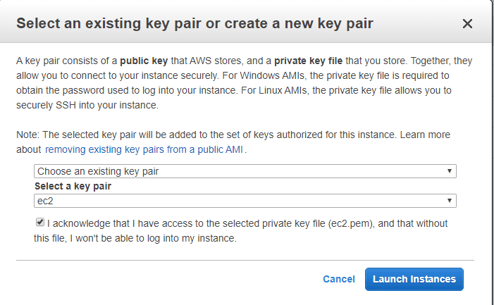 On the Configure Security Group page accept the default which allows SSH access, select Review and Launch, then Launch. The popup that appears allows you to choose an existing key pair or create a new one. This key pair will be used for SSH access, so be sure to save the .pem file for later:
